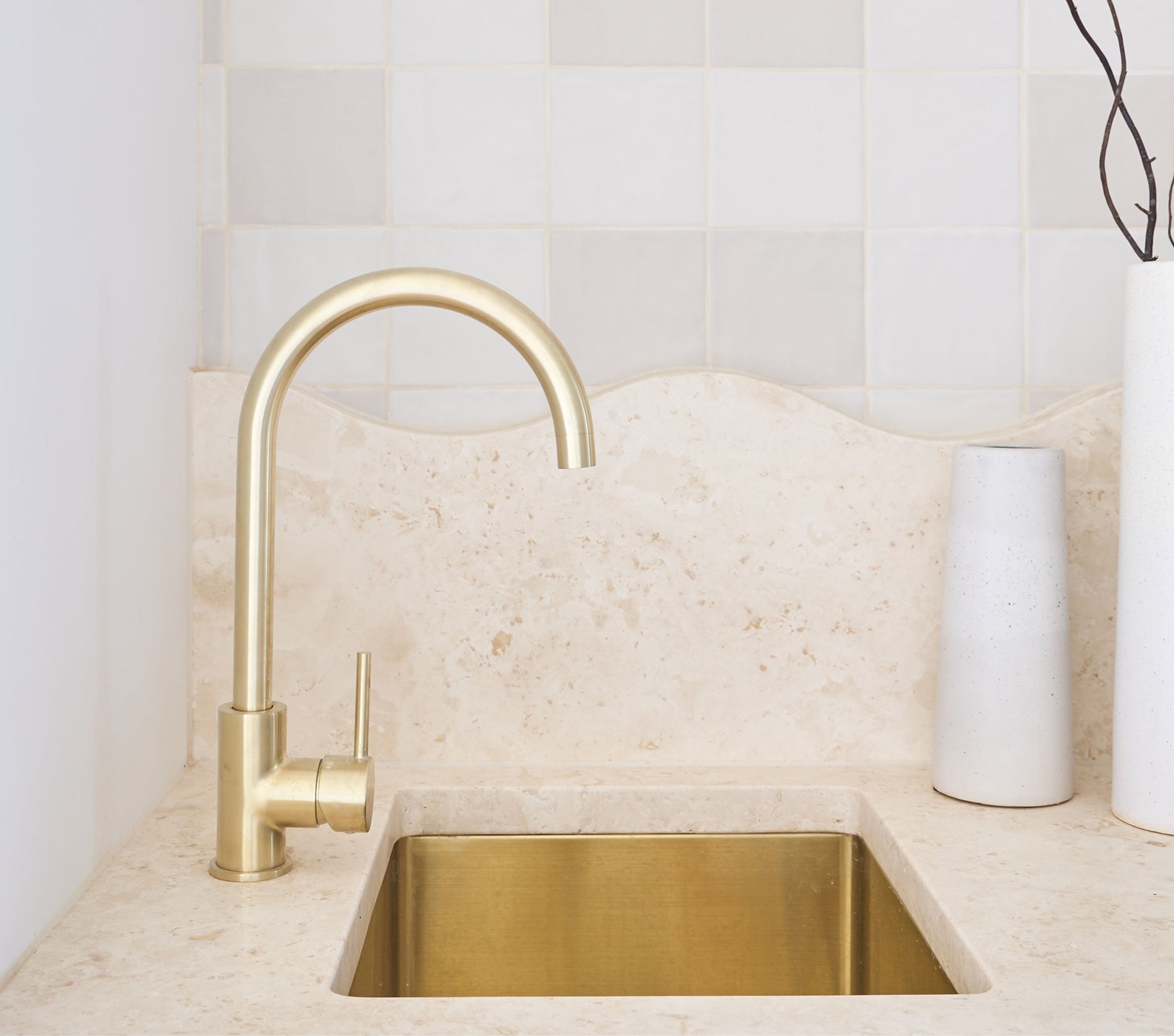 “I selected mountain stone basins and walnut cabinetry to create warmth and depth, and elevated these elements with ABI’s brushed brass fittings, which paired seamlessly with the overall palette. I also wanted to introduce a subtle sense of playfulness, which inspired the travertine wave splashback — a feature I then echoed through the custom wave bedheads in each suite to create continuity and character throughout the spaces.”