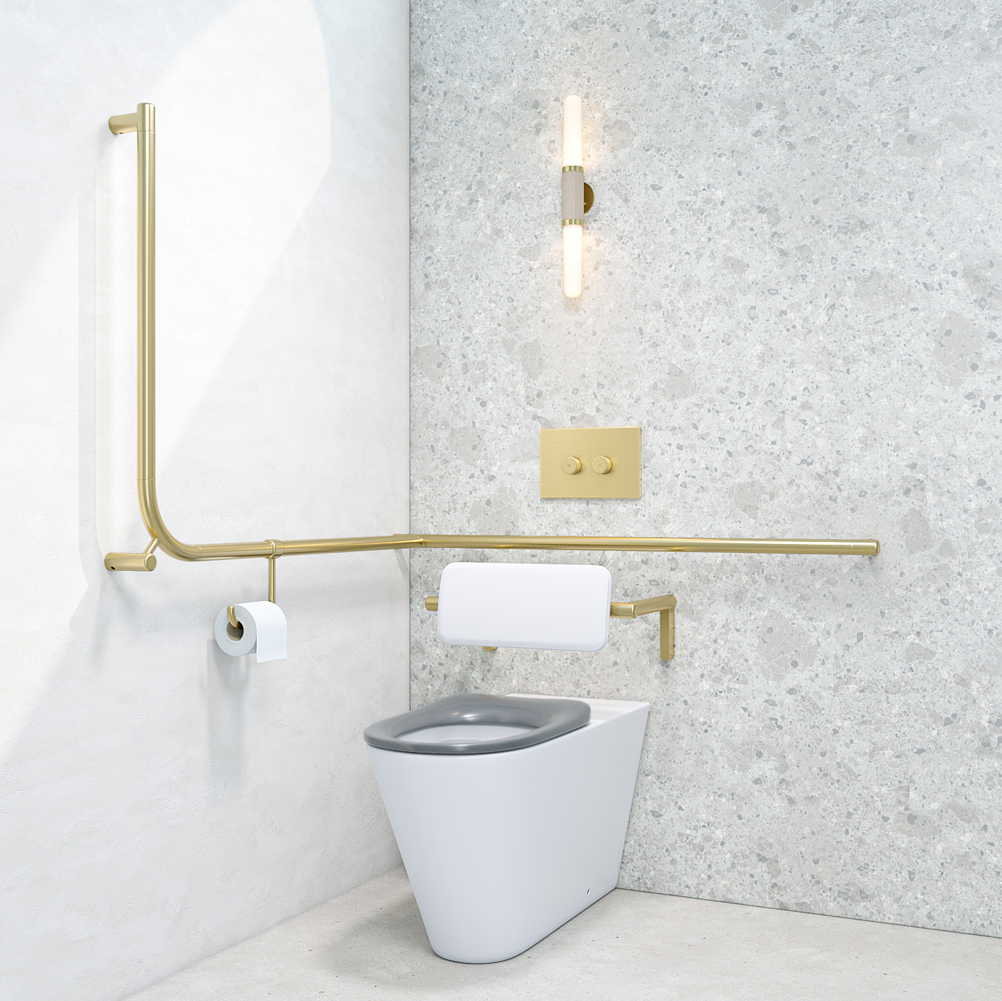 The Aliro Accessible Pneumatic Flush Button is available in four signature finishes: brushed brass, brushed copper, brushed gunmetal, and brushed stainless steel. It is designed to complement our entire Aliro Collection.
