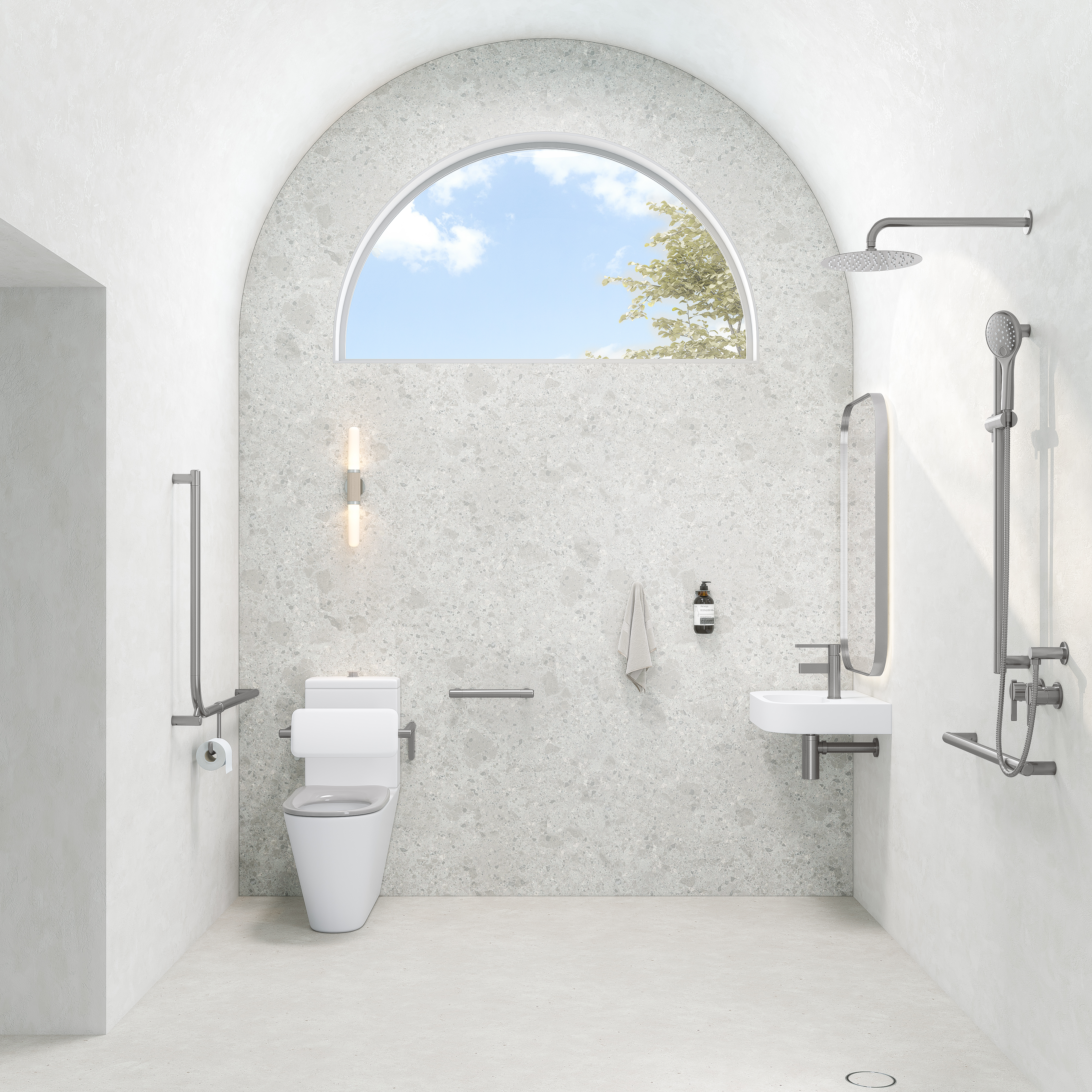 – Our Aliro Accessible Shower Grab Rail Set is designed and tested to meet AS1428.1 Standards. It is the responsibility of the purchaser to consult a professional prior to installation to ensure the products are installed in a manner that maintains their compliance with the relevant Standards and meets all applicable regulatory requirements. ABI Interiors accepts no liability for any non-compliance with the Standards that occurs as a result of installation that is not in accordance with ABI’s installation guidelines or the Standards, or any failure to meet any regulatory requirements.