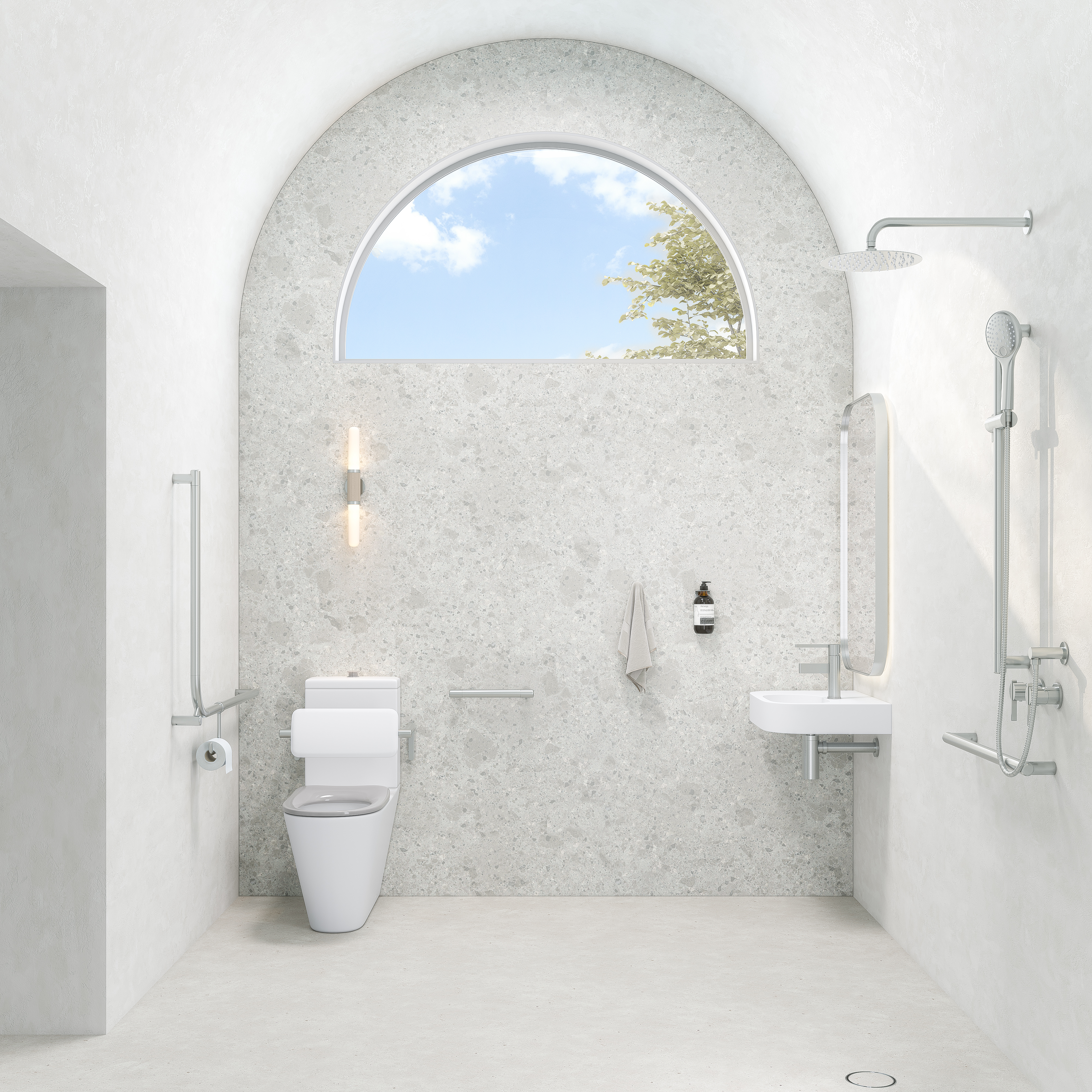 – Our Aliro Accessible Shower Grab Rail Set is designed and tested to meet AS1428.1 Standards. It is the responsibility of the purchaser to consult a professional prior to installation to ensure the products are installed in a manner that maintains their compliance with the relevant Standards and meets all applicable regulatory requirements. ABI Interiors accepts no liability for any non-compliance with the Standards that occurs as a result of installation that is not in accordance with ABI’s installation guidelines or the Standards, or any failure to meet any regulatory requirements.