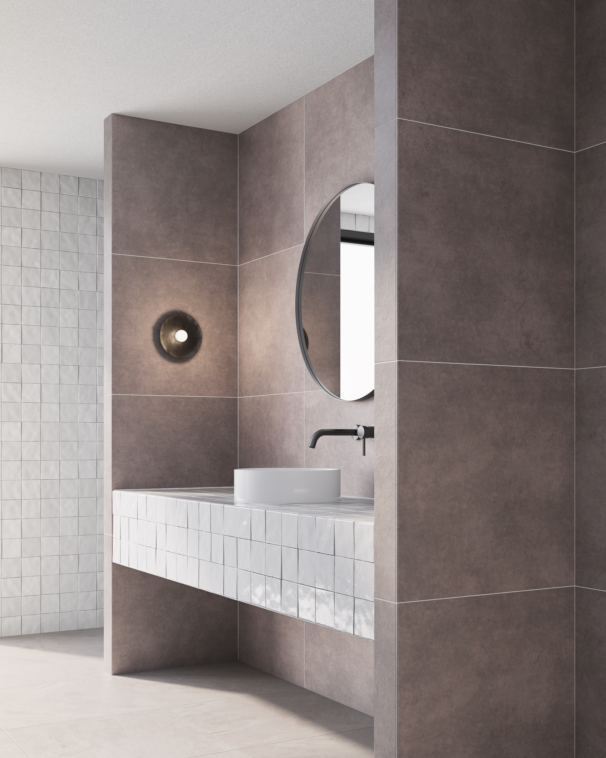 The Arezzo Concrete Look wall and floor tile features a highly durable porcelain construction, rectified edge, and a textured finish.