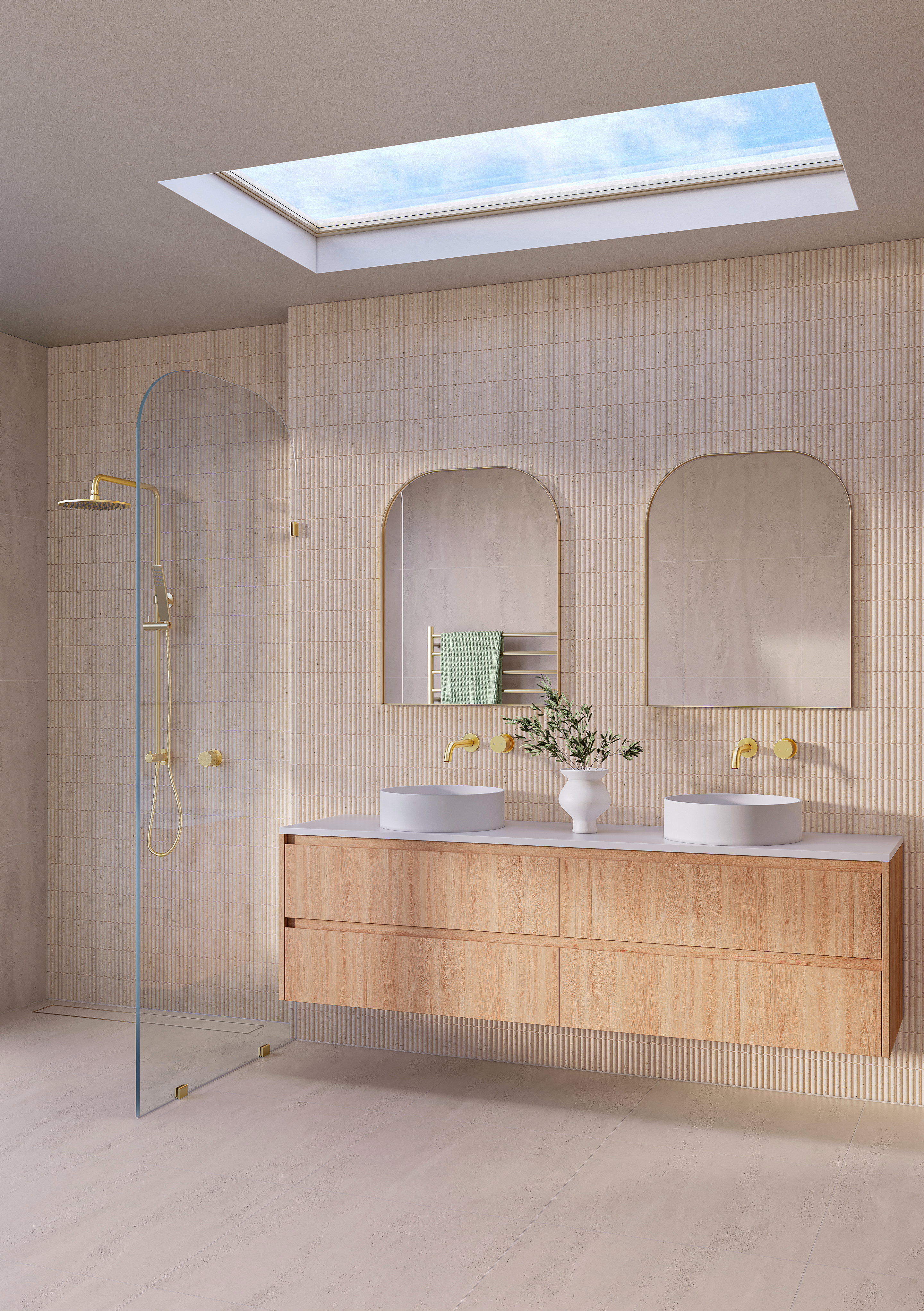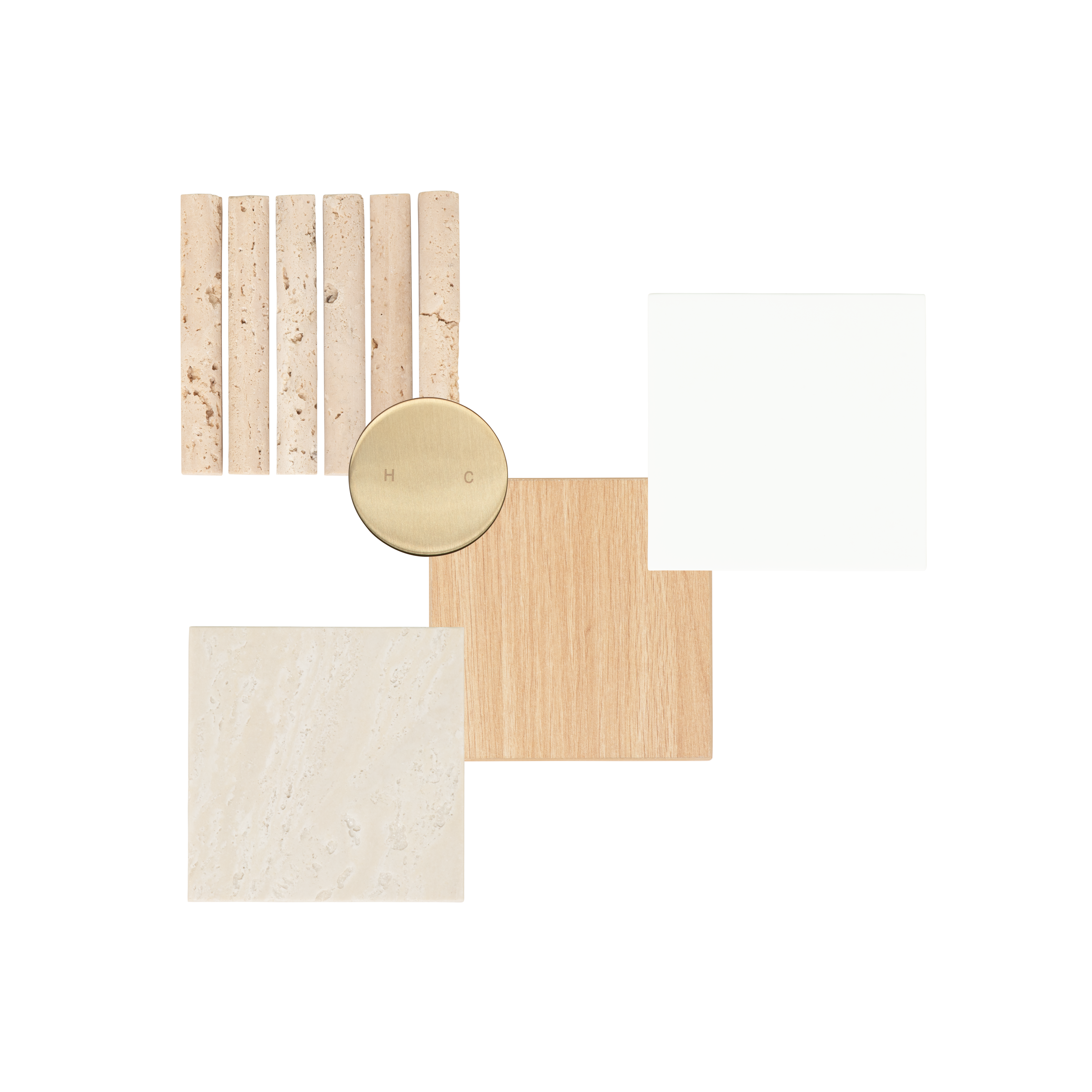 | What's in the Box | 1 x Tapware: Milani Progressive Handle – Brushed Brass 1 x Vanity: Pure Oak (Sample) 1 x Basin: Solid Surface – Matte White (Sample) 1 x Wall Tile: Ravenna Travertine Rounded Finger Mosaic Tile (Sample) 1 x Floor Tile: Izmir Travertine Look Tile – Light Beige (Sample) 1 x Style card showcasing how the finishes work together in a space |