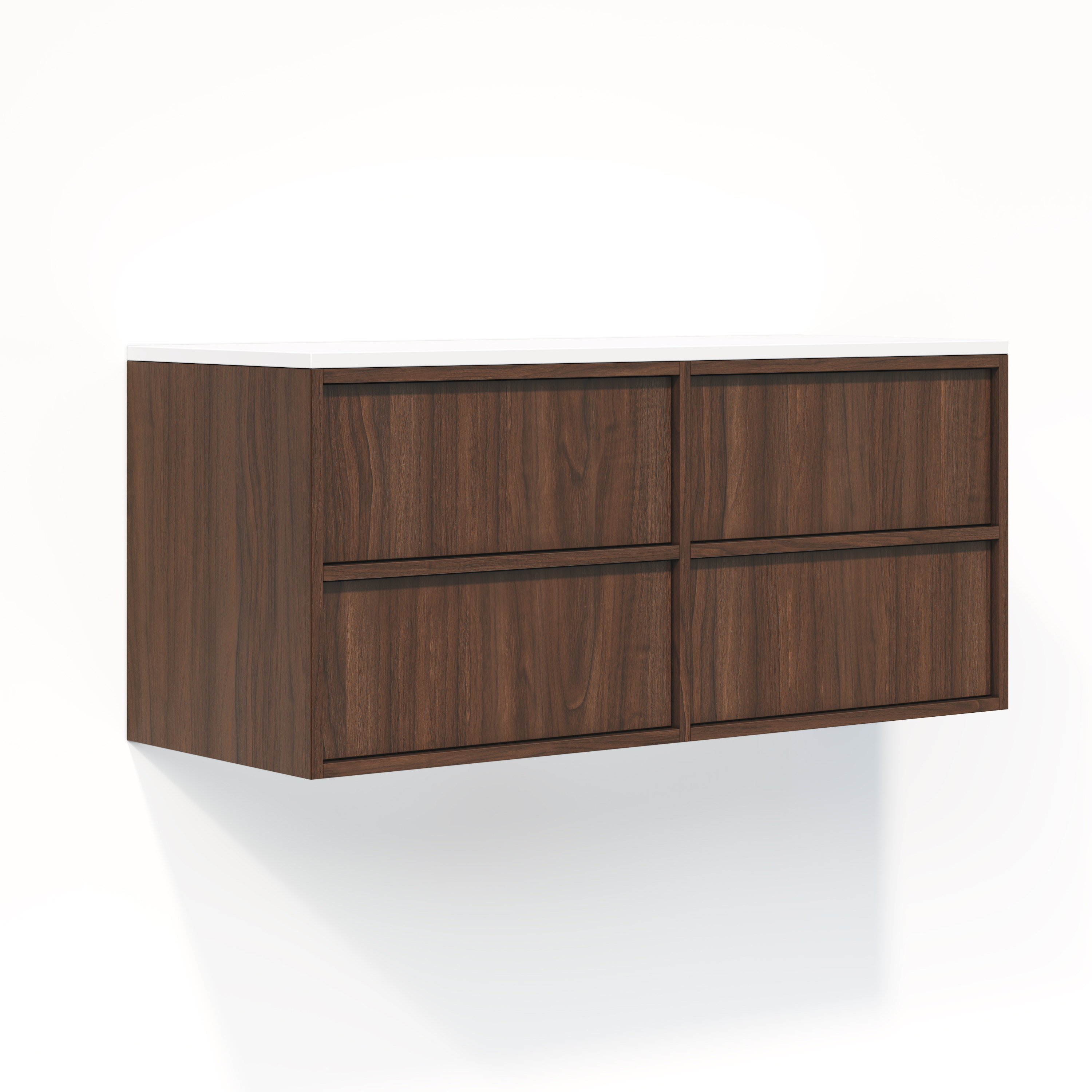Designed with both style and functionality in mind, this wall-hung vanity is crafted from high-density, moisture-resistant particle board. Its ultra-soft closing drawers — one featuring an integrated cutout for seamless plumbing installation — ensure effortless convenience.