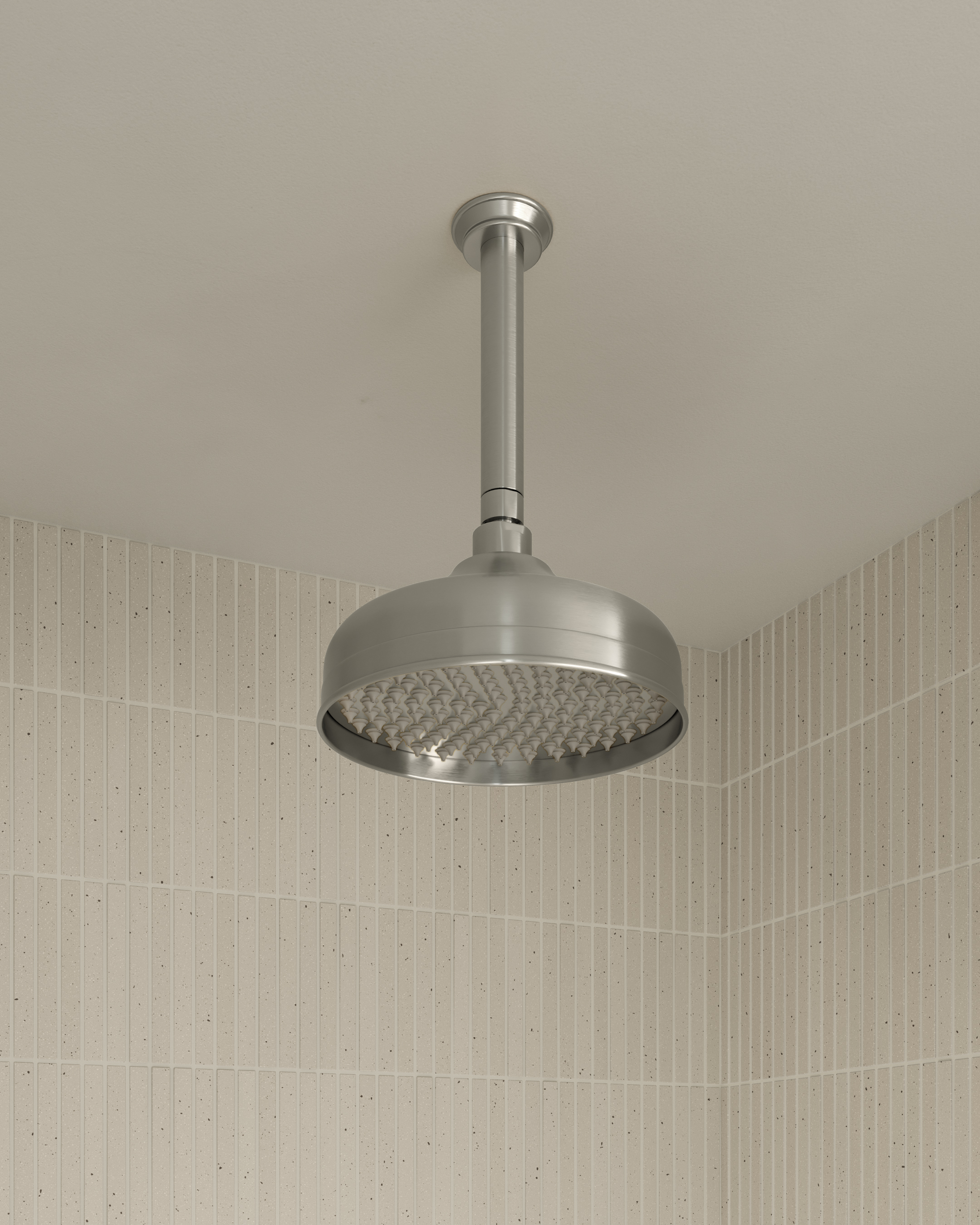 The ceiling-mounted Shower Dropper from the Kingsley Collection inspires exceptional luxury when paired with one of ABI Interiors’ rain shower heads. Made from solid brass and featuring Kingsley’s ornate detailing, its elegant design and durable construction ensure easy maintenance and long-term use.