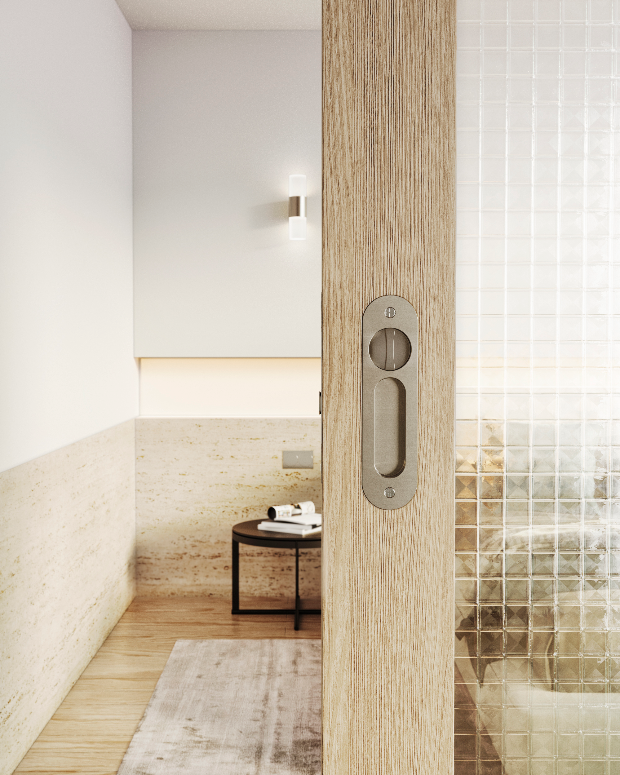 To engage the latch, simply rotate the internal lock. If required, the Leroy Sliding Door Handles feature an emergency coin release, which is accessible from the external side of the door.