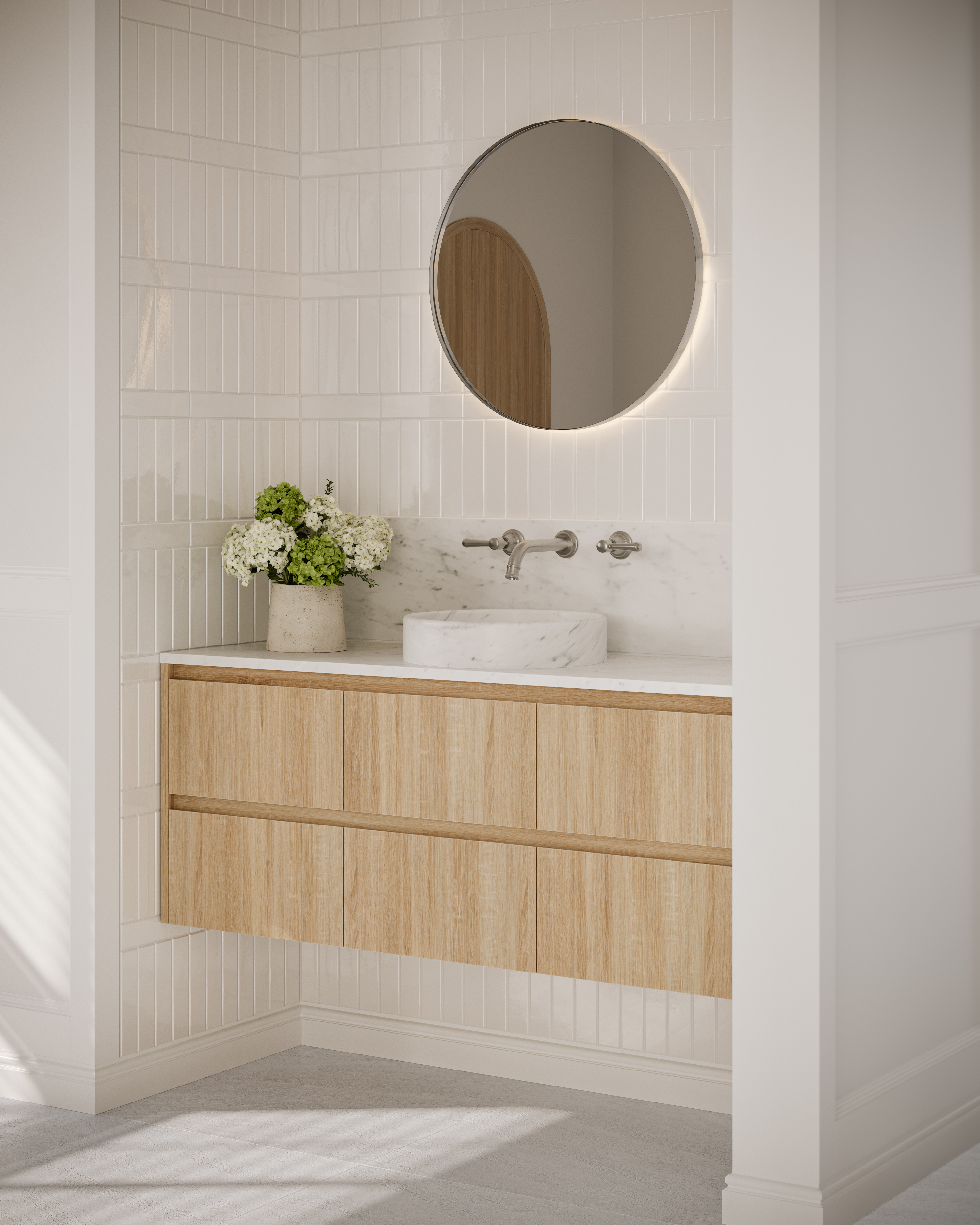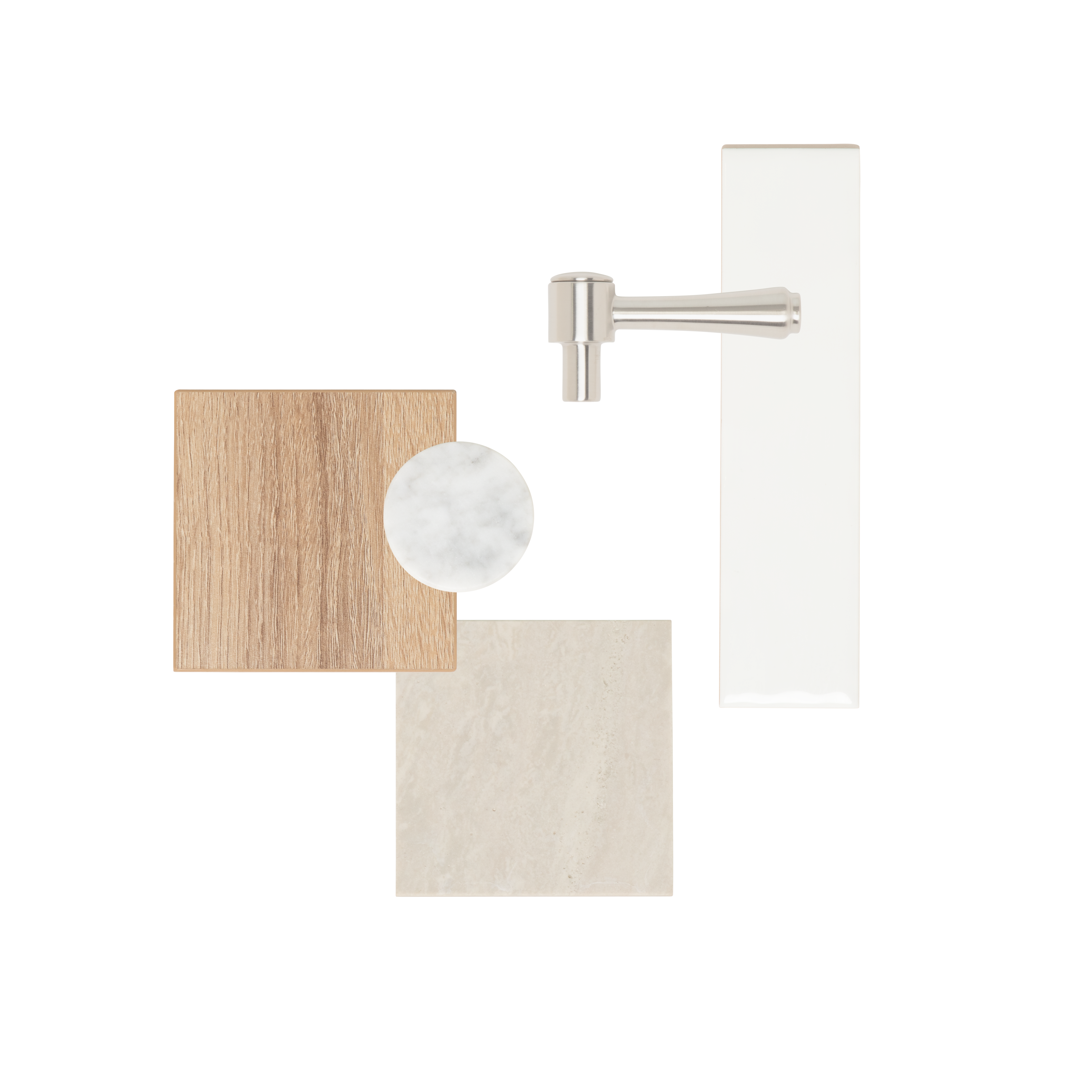| What's in the Box | 1 x Tapware: Kingsley Assembly Handle – Brushed Nickel 1 x Vanity: White Ash Oak (Sample) 1 x Basin: Pedra Stone Sample – Carrara Marble (Sample) 1 x Wall Tile: Tropea Natural Edge Subway Tile - Gloss White (Sample) 1 x Floor Tile: Izmir Travertine Look Tile - Grey (Sample) 1 x Style card showcasing how the finishes work together in a space |