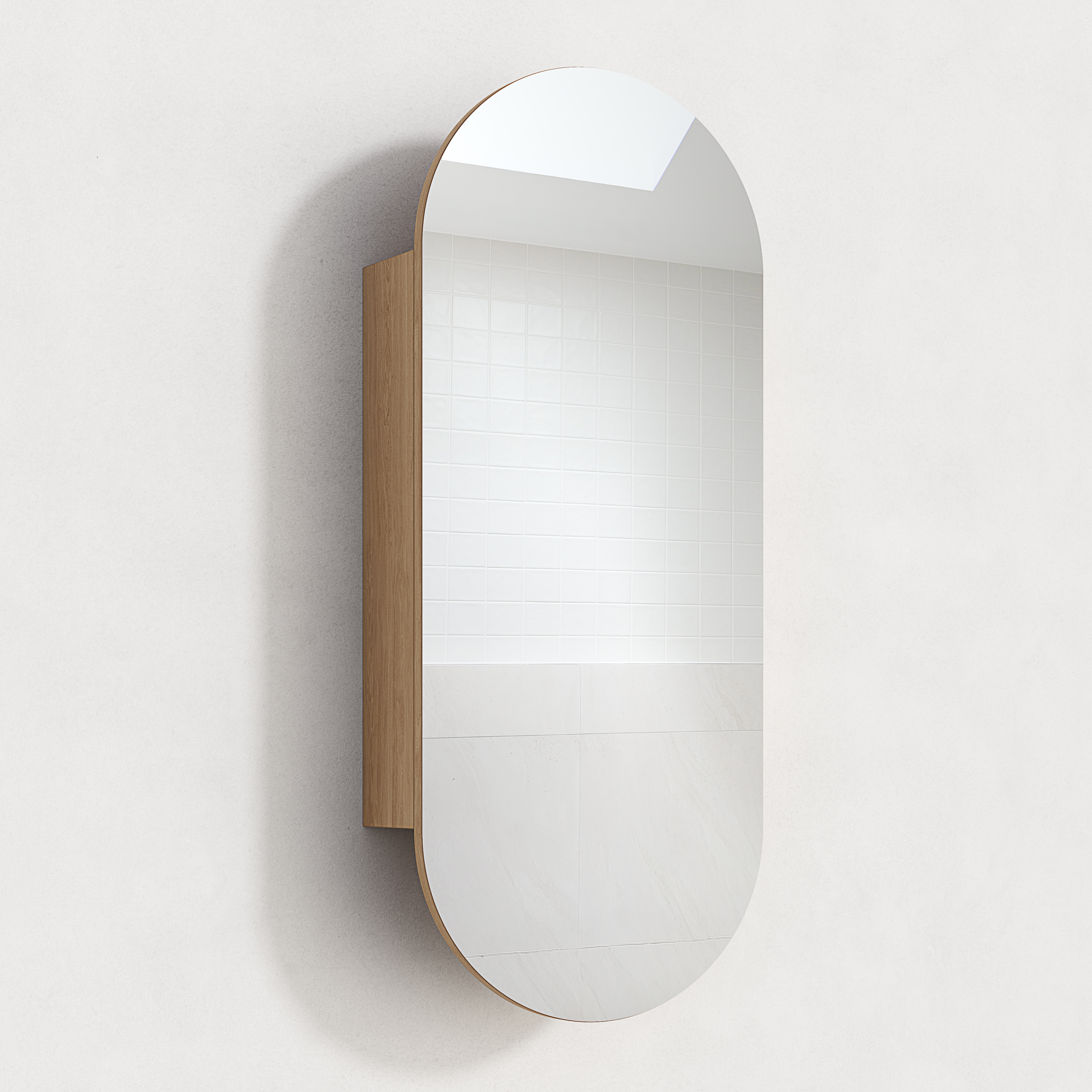 With its elegant, curved oval design, the Mona Pill Mirror Cabinet adds a modern touch to any bathroom, perfectly balancing form and function. Featuring a warm Pure Oak finish and soft, rounded edges, this mirror cabinet complements a wide range of bathroom styles.