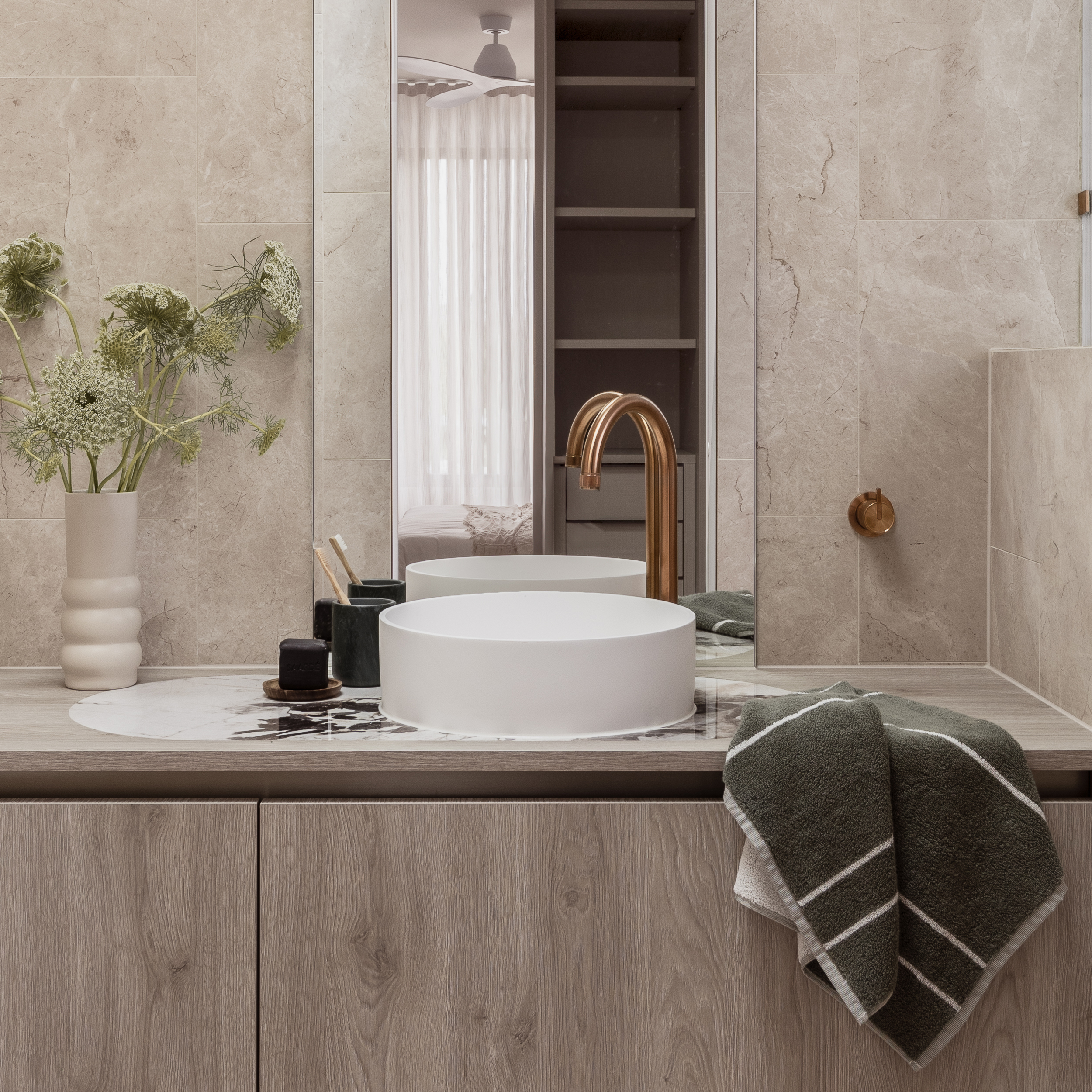 Redefine your interiors with textured tapware. The reeded details of our Namika Minimal Mixer evoke a tactile experience, transforming your space into a world to be seen and felt.