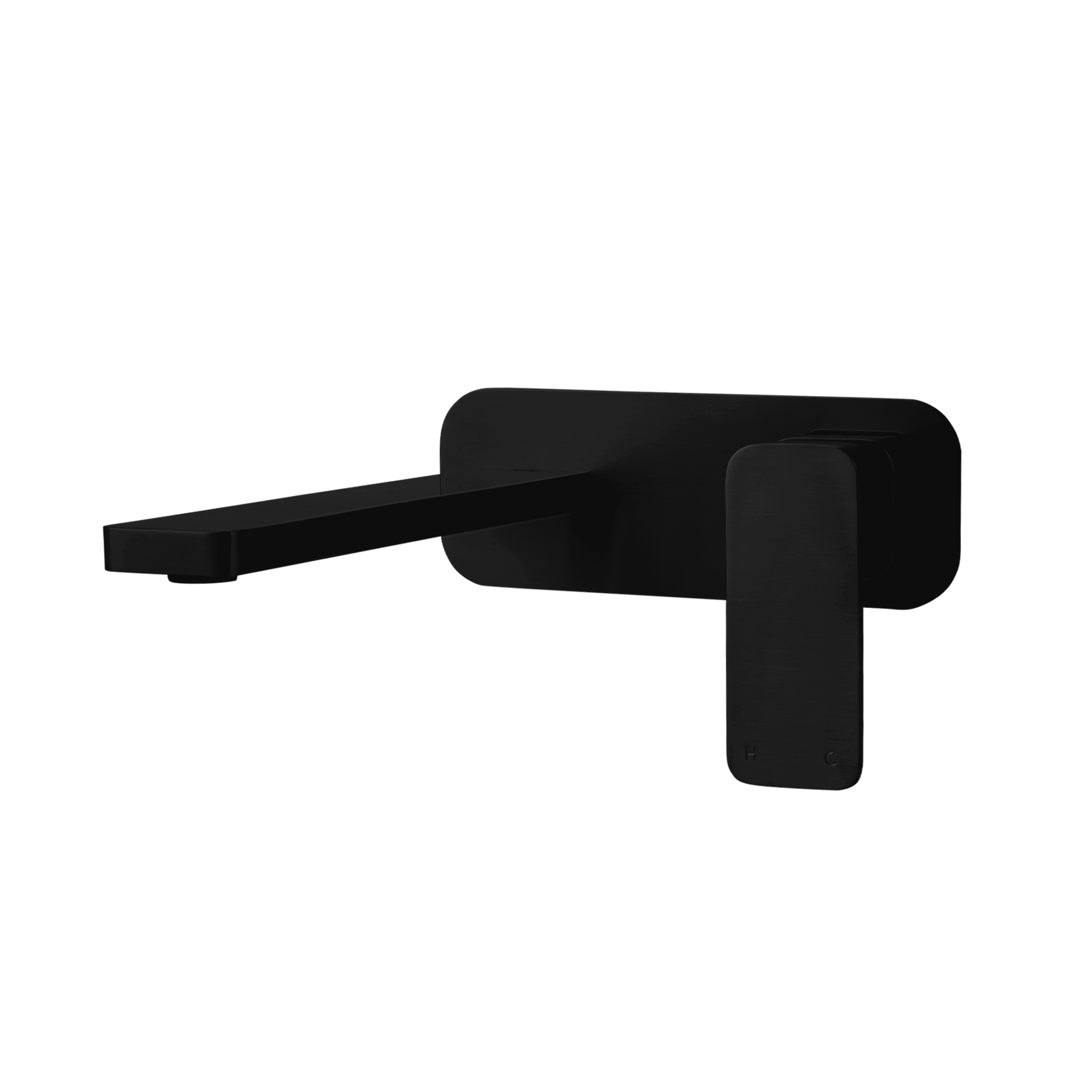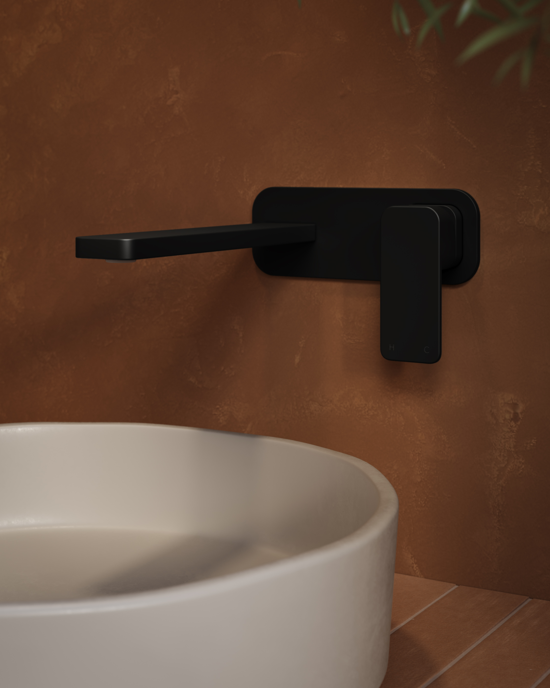 The set also features a matching, flat-edged wall-mounted spout with rounded corners for a sophisticated, modern aesthetic.