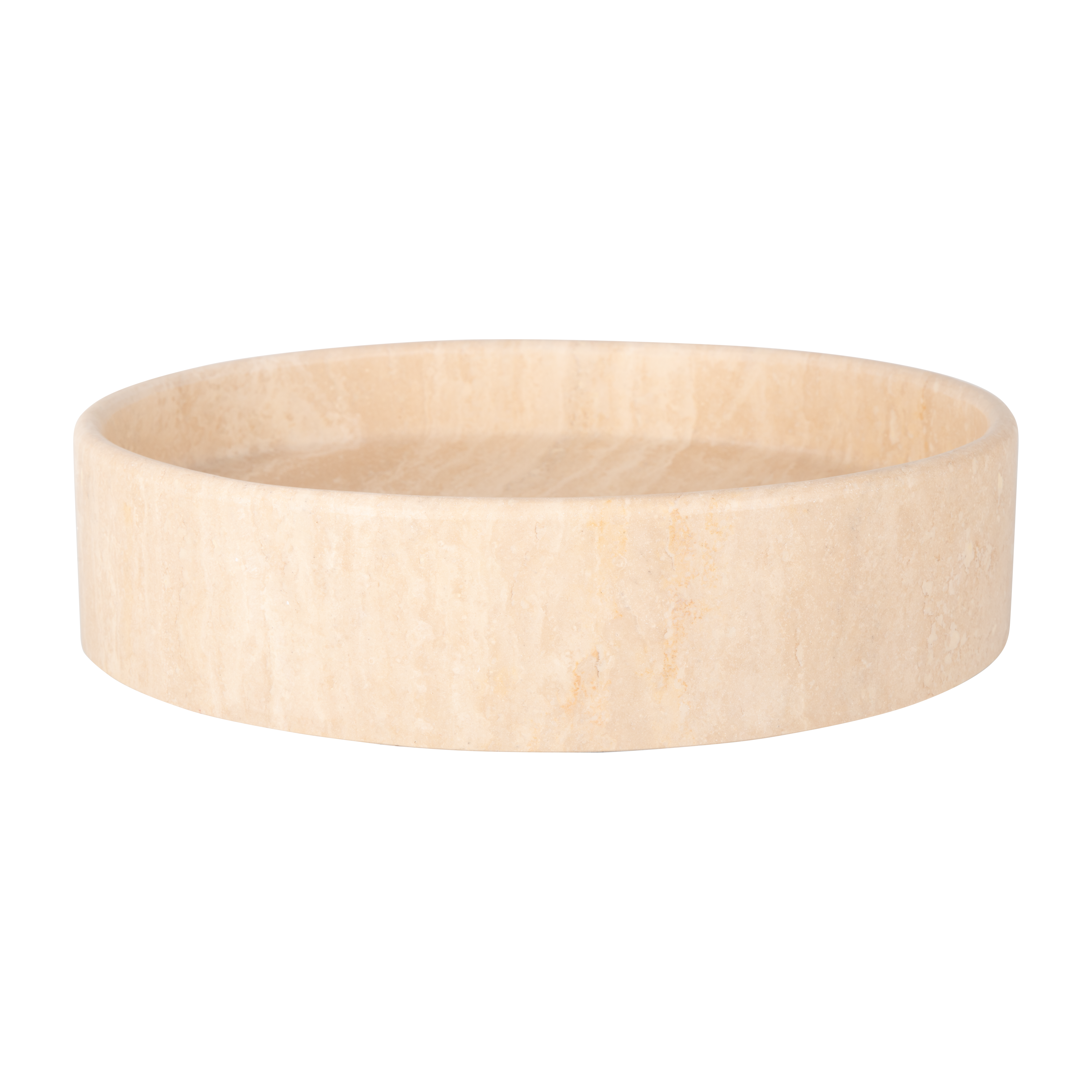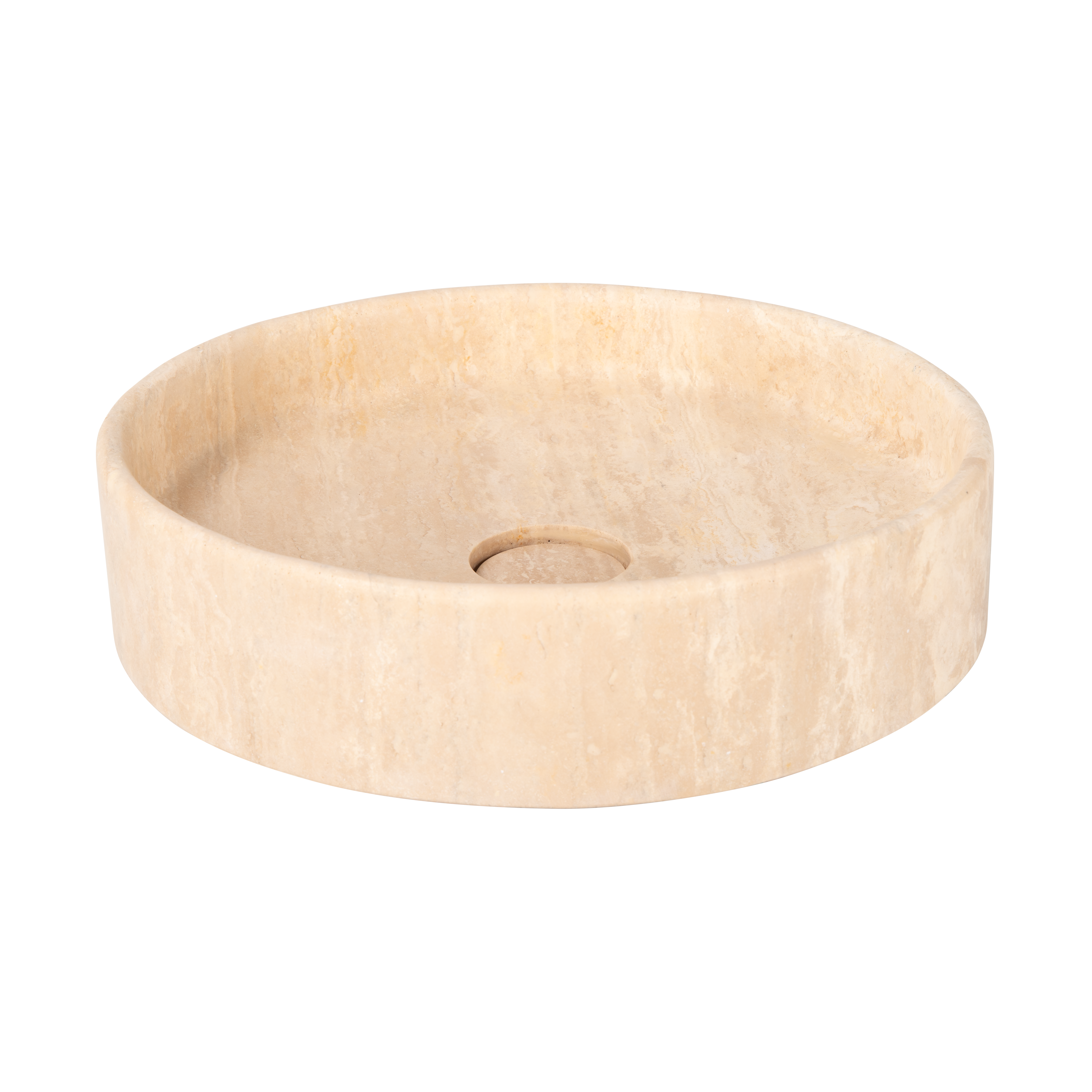 The Pedra Round Basin Sink is crafted from solid travertine stone and features a sleek, curved design that exudes understated elegance. Its bench-mounted design suits both singular and double bathroom vanities.