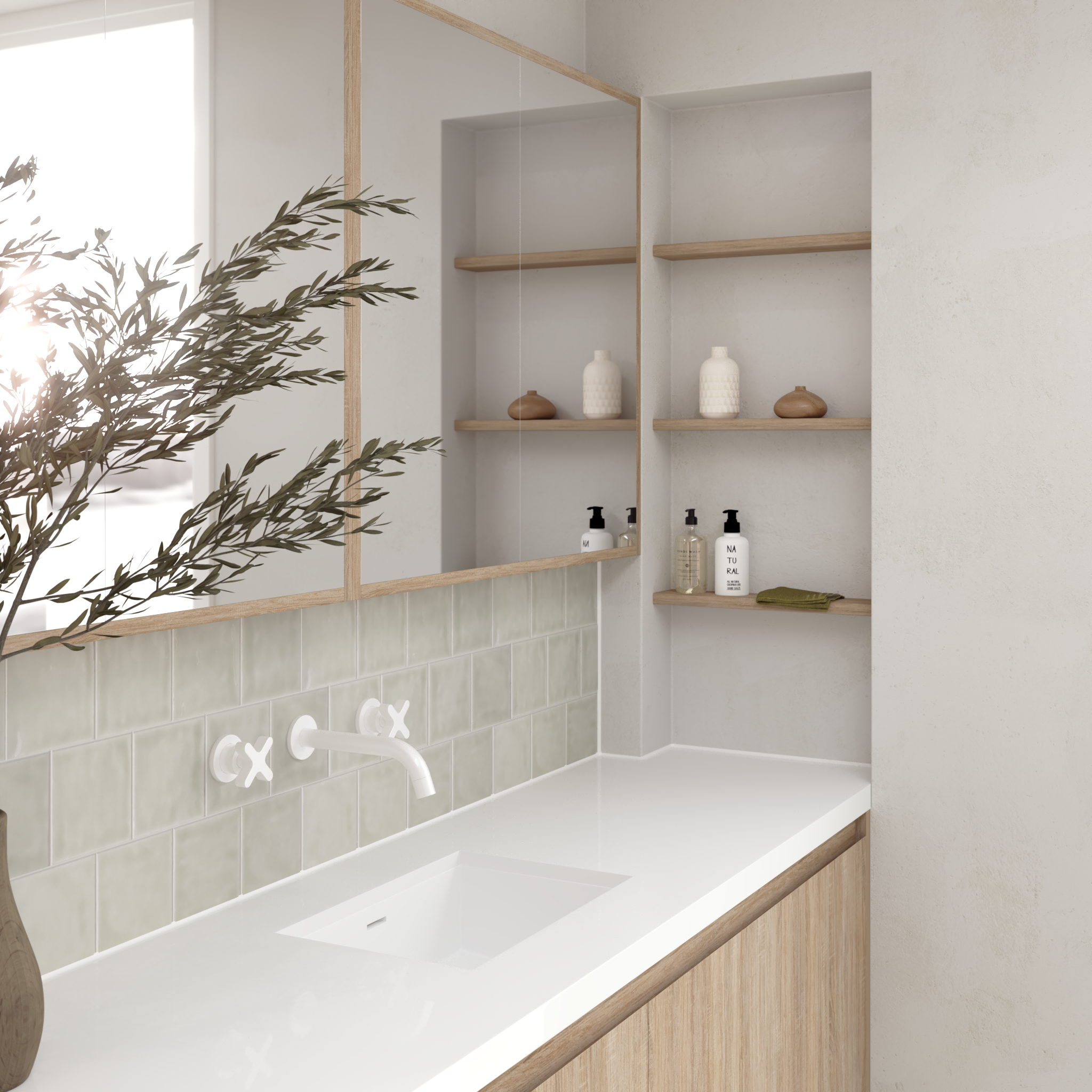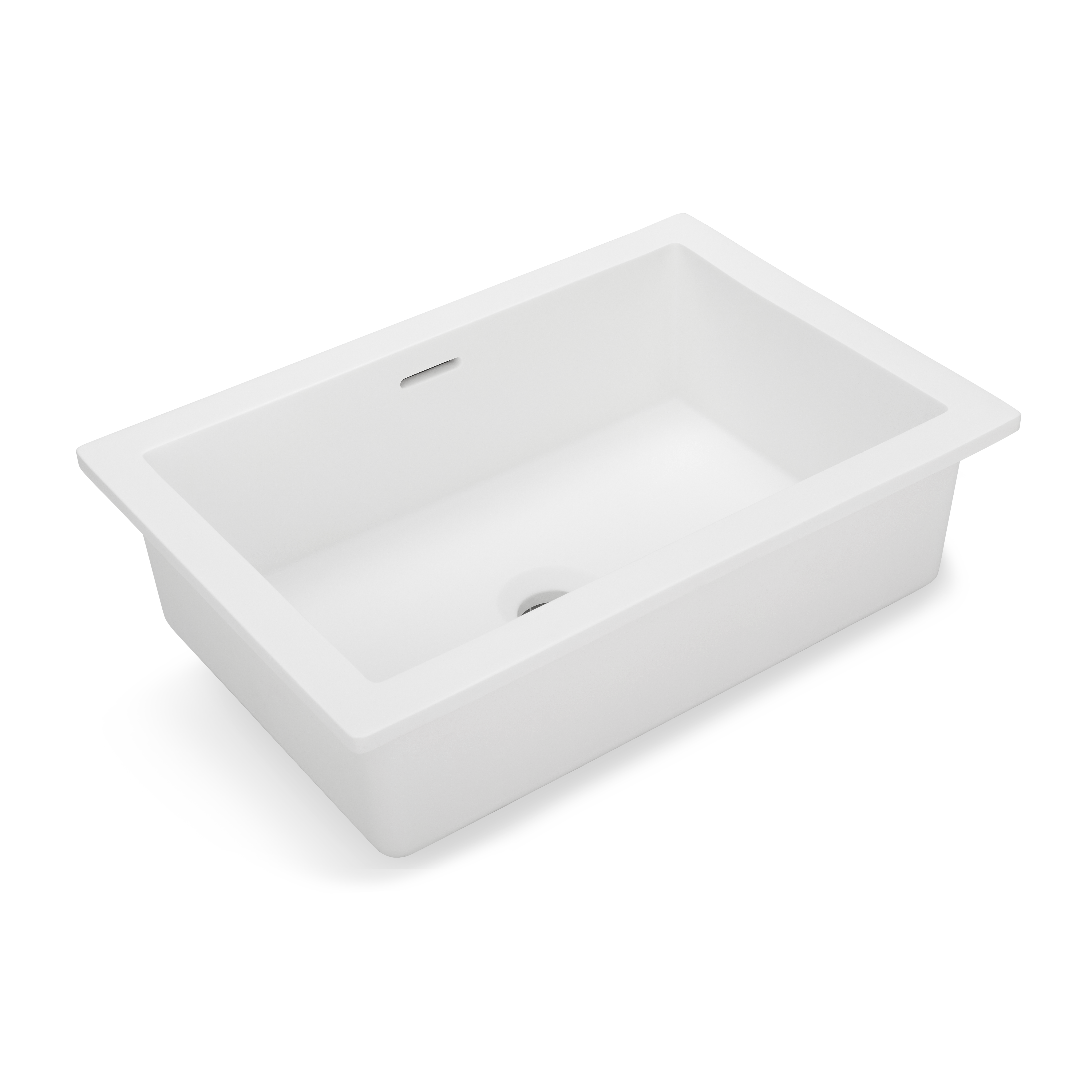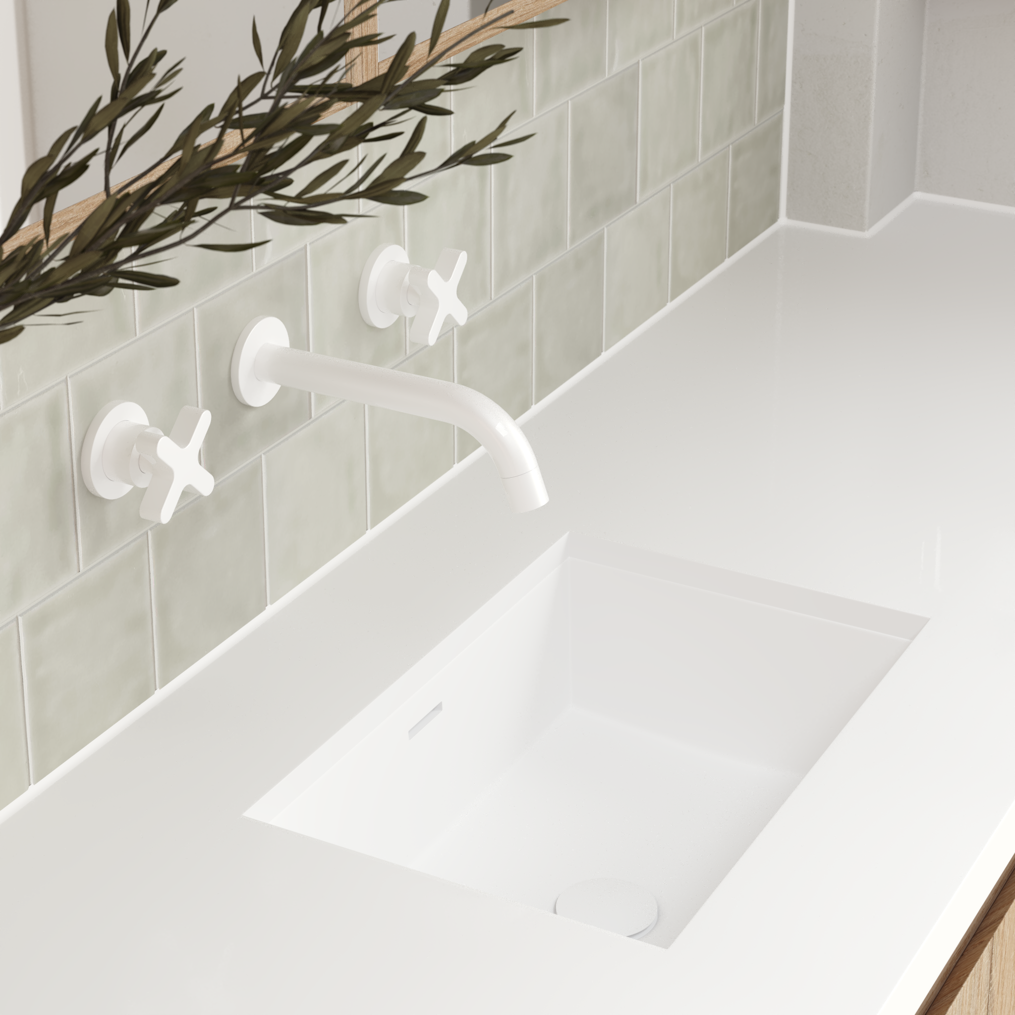 A rectangular under counter basin with a flush, smart appearance, the Zuri enhances bathroom or powder room spaces. Its solid surface construction ensures superior strength and resistance, while its matte white finish reinforces its aesthetic appeal.